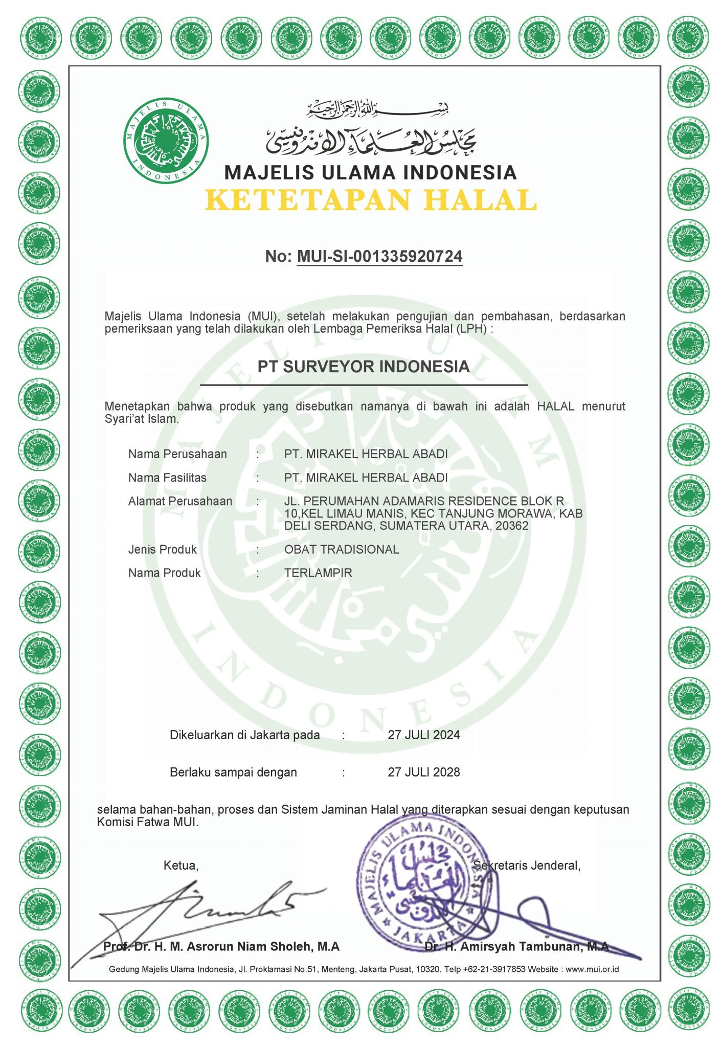 Fatwa Halal Produk PT Mirakel Herbal Abadi