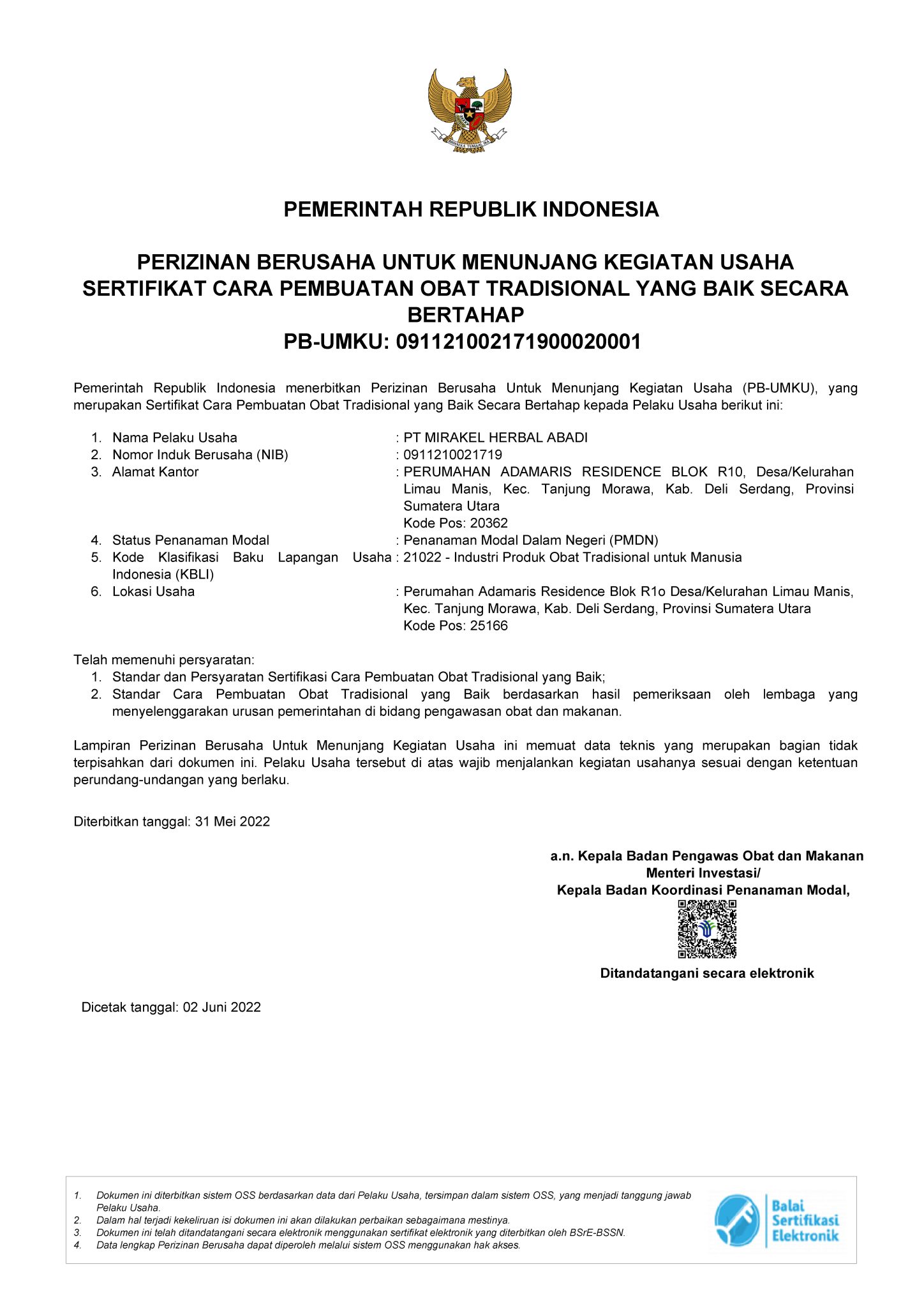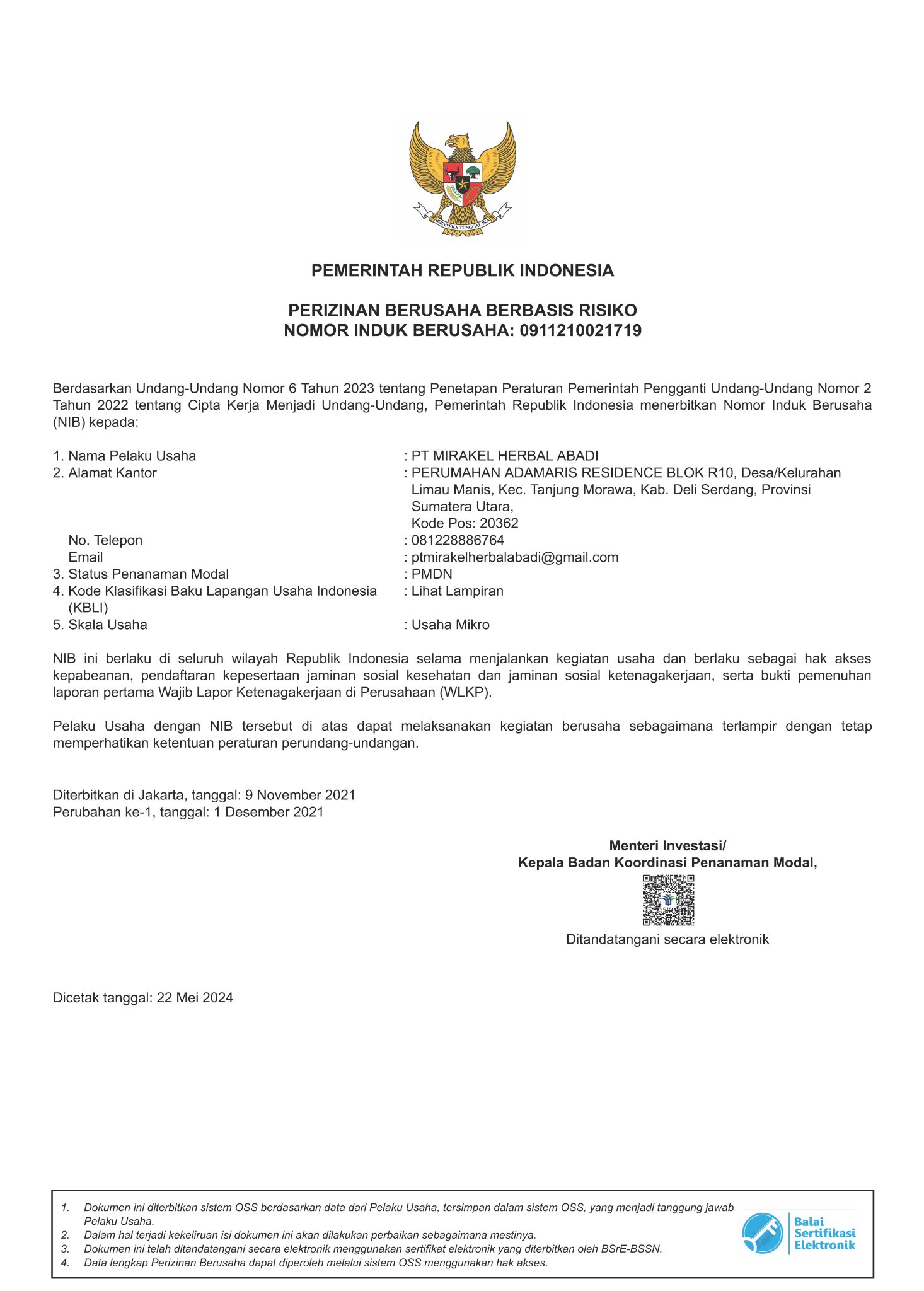 NIB PT. Mirakel Herbal Abadi Revisi