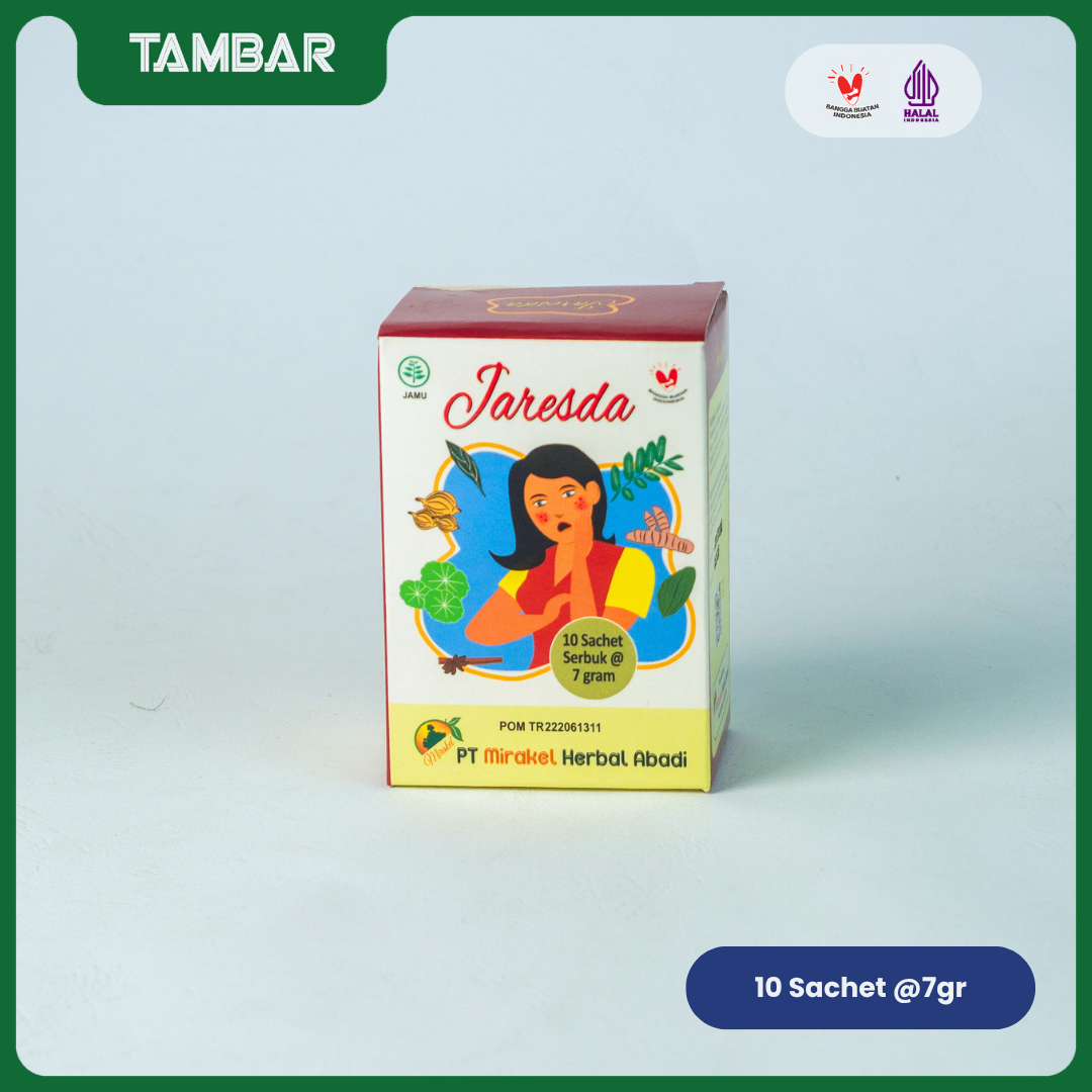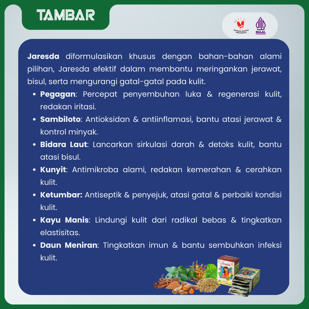 Jaresda adalah Obat Herbal berbentuk serbuk yang diformulasikan dari tanaman Nusantara untuk membantu merawat kesehatan kulit secara alami. Diperkaya dengan bahan-bahan pilihan yang dikenal secara turun-temurun, Jaresda efektif untuk membantu meringankan jerawat, bisul, dan gatal-gatal pada kulit.