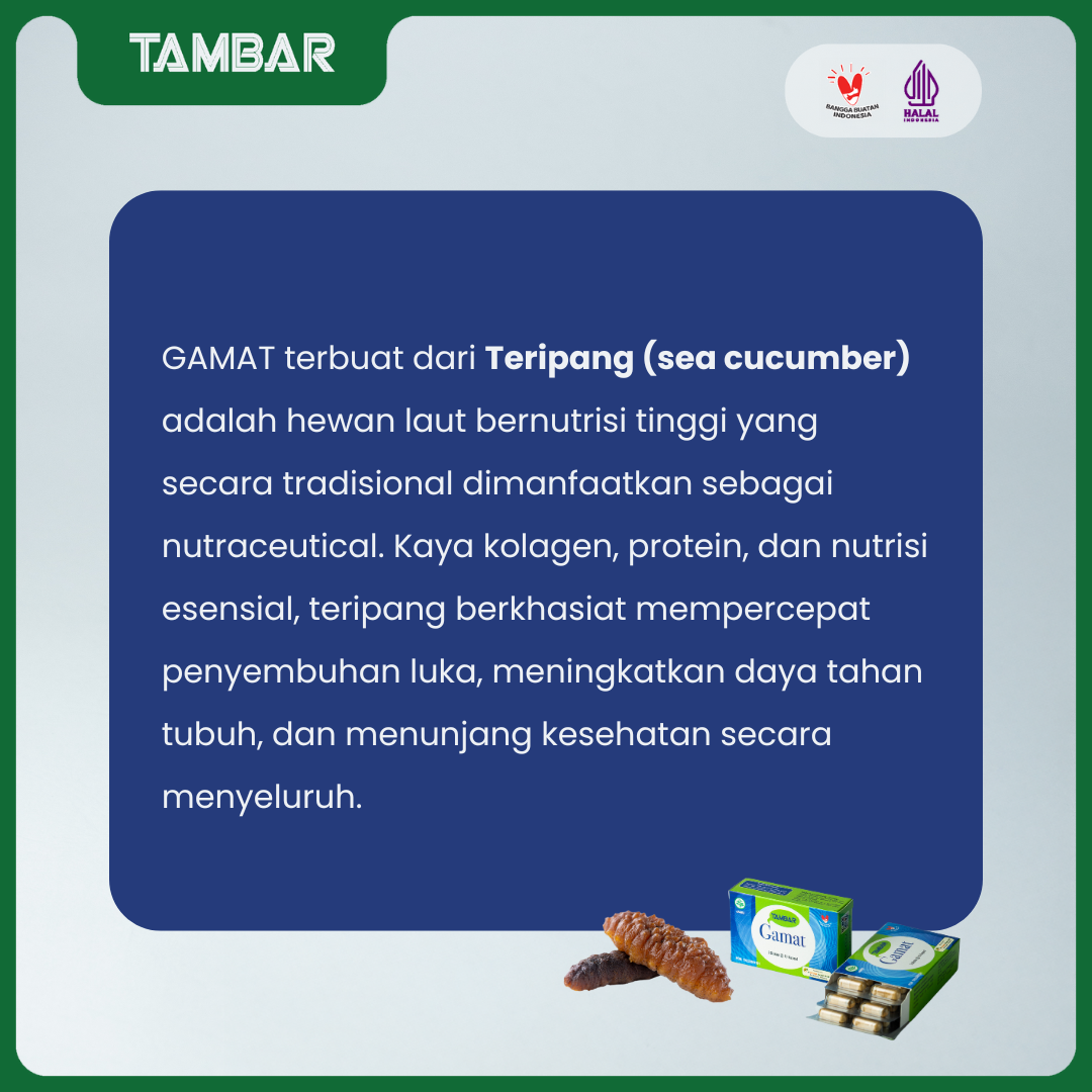 Herbal berkualitas dari ekstrak teripang laut pilihan. Diproses dengan teknologi modern tanpa bahan kimia berbahaya, produk ini kaya akan kolagen, protein, dan nutrisi alami yang telah dipercaya secara tradisional untuk menjaga imunitas, mempercepat pemulihan, dan meningkatkan vitalitas tubuh. Kandungan utama: Teripang (gamat)