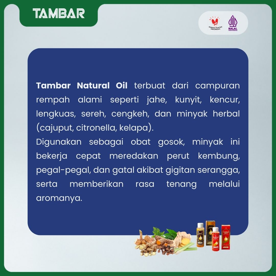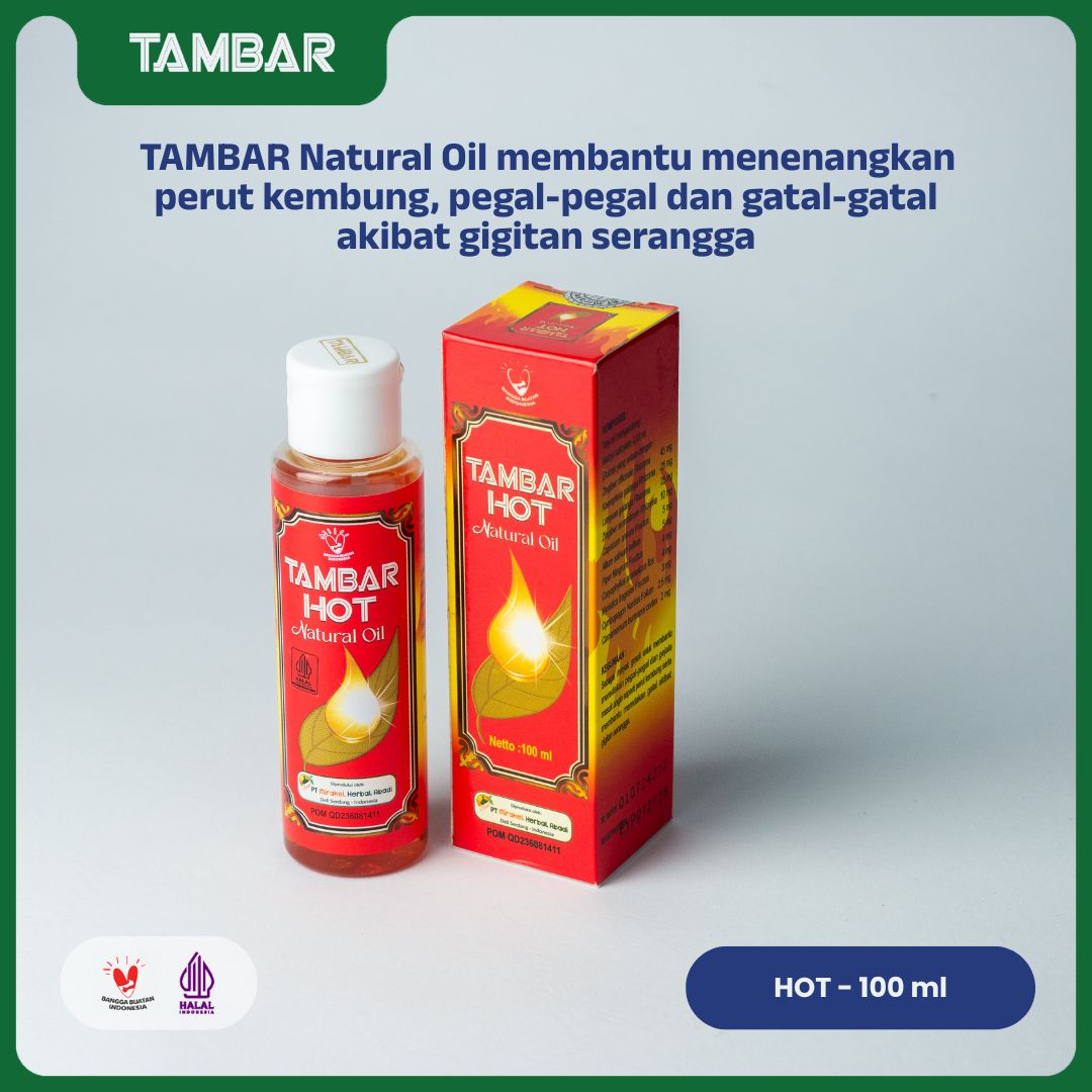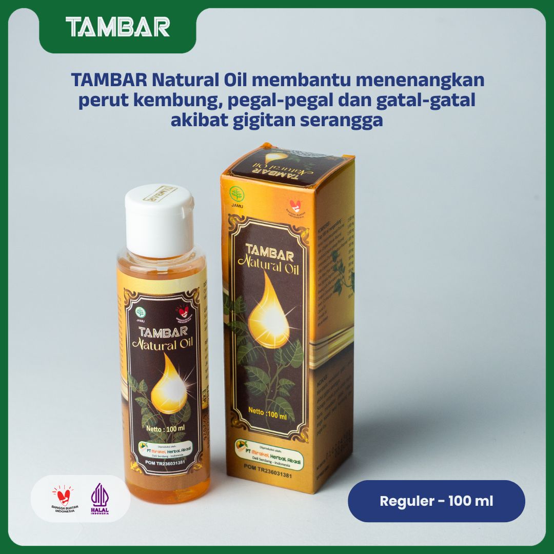TAMBAR Natural Oil – Minyak gosok herbal dengan campuran rempah pilihan untuk meredakan perut kembung, pegal, dan gatal akibat gigitan serangga. Cepat meresap, alami, dan efektif menjaga kesehatan tubuh & kulit. Tersedia varian Reguler dan Hot.