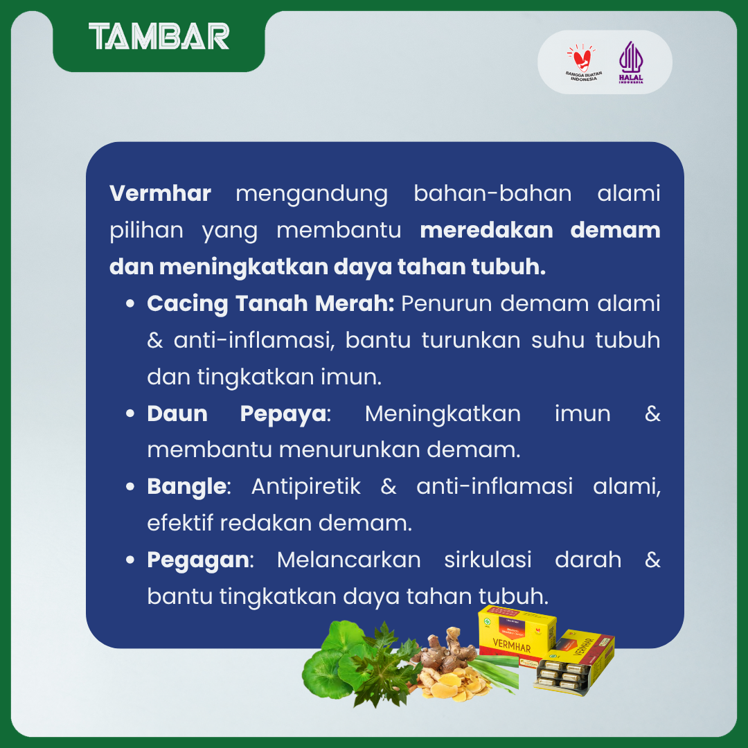 VERMHAR adalah obat herbal yang diformulasikan dari bahan-bahan alami dengan kombinasi tepat untuk menurunkan demam secara alami dan membantu mempercepat pemulihan tubuh.